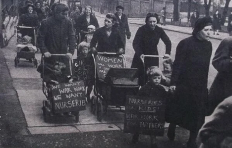 Mothers in Hampstead, England, marching for the opening of more Day Nurseries, 1943